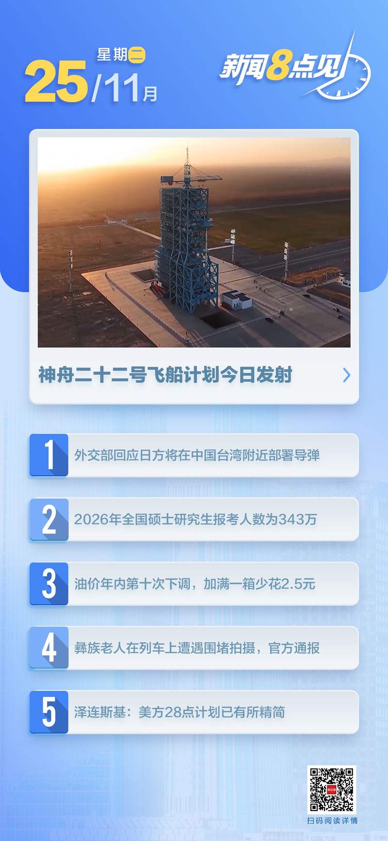 【时事动态】神舟二十二号飞船定于11月25日发射。据中国载人航天工程办公室介绍,长征二号F遥二十二号运载火箭已完成推进剂加注,计划于2025年11月25日从我国酒泉卫星发射中心定时发射神舟二十二号飞船。神舟二十一号航天员在轨运行正常,状态良好。 。整体设计不仅延续了中国航天标志的美学传承,还创新融入了应急救援元素,完美定义了“用航天力量守护生命”的核心价值,展现了中国航天的技术实力和人文关怀。 。外交部:这种趋势非常危险。 11月24日,外交部发言人毛宁主持例行会议。有记者问:日本防卫大臣视察时23日,他在访问琉球群岛自卫队基地时表示,日本将如期向该基地部署中程防空导弹。据报道,该基地距离中国台湾仅110公里。中方对此有何评论?毛宁表示,日本向中国台湾周边的西南岛屿倾倒进攻性武器,是蓄意制造地区紧张局势,引发军事对抗。对于日本首相高市早苗涉台不实言论,这一趋势极为危险,需要周边国家和国际社会高度警惕。 。据教育部消息,2026年全国硕士学位招生考试将于2025年12月20日至21日举行。据统计,2026年全国硕士学位招生考试报考人数为343万人。 。添加50升92号汽油可减少2.5元。一个11月24日24时,国内成品油零售价格今年第十次下调。国家发改委官网透露,近期国际石油市场价格波动较大。对比11月24日前10个工作日均价与最终调价前10个工作日均价,按照现行成品油价格形成机制,11月24日24:00起,国内汽油、柴油(标准品,下同)价格每吨分别下调70元和65元。折算成涨价幅度,92号汽油、95号燃油、0号柴油每升分别下调0.05元、0.06元、0.06元。今年以来,国内成品油零售价格经历了23次调整周期,其中7次上涨、6次暂停、10次下调。高庆翠,卓创资讯成品油分析师报告指出,实现零售价下调后,消费者用油成本下降,油箱容量增加。 50升小型私家车加满一箱92辛烷值燃油,比以前便宜2.5元。 。 2024年12月4日23时18分,广东省深圳市宝安区航城街道洲石路新建深江铁路五段施工现场发生山体滑坡,造成13人死亡,直接经济损失约7261万元。 2025年11月24日,广东省应急管理厅网站发布了《“12·4”申江铁路垮塌重大事故调查报告》。广东省政府事故调查组认定,“12·4”申江铁路主梁垮塌事故系涉及非法开挖单位造成铁路线以上局部塌方的生产安全事故。隧道掌子面。由于未采取有效的工程措施处理异常工况,导致地面塌陷,造成人员随着地面塌陷而倒塌死亡。 。叶寒冰严重违反党的政治纪律、组织纪律、廉洁纪律、工作纪律和生活纪律,构成严重工作违法行为,涉嫌受贿罪。党的十八大后他没有停下来,也没有停下来。性质严重,影响恶劣,应严肃处理。根据《中国共产党纪律处分条例》、《中华人民共和国行政法》、《公职人员政府处分法》等有关规定,经中央纪律检查委员会常务委员会会议研究,并报中共中央委员会。经批准,决定给予叶寒冰延长退党资格;免去其国家公职监事会职务;终止其四川省第十二次代表大会代表资格;违反纪律、违法所得的违法所得,没收违法所得;其涉嫌犯罪问题将依法移送检察院侦查起诉,涉案财物一并移送。 。王惠民严重违反党的政治纪律、组织纪律、廉洁纪律和生活纪律,构成严重违纪违法,涉嫌受贿。其对党的十八大后不予防范、制止的行为,性质严重,造成不良影响,应当严肃处理。根据《中国共产党纪律处分条例》根据《中华人民共和国行政法》、《公务员处分法》等有关规定,经中央纪委常务委员会会议研究并报中共中央批准,决定给予王惠民开除党籍;按照规定取消其待遇;没收其违法所得;将其涉嫌犯罪的行为移送检察机关依法查处,并移送国家药品监督管理局原党组成员、副局长陈世飞涉嫌受贿罪,已被国家监委移送检察院审查起诉。经审理,上海市检察院以涉嫌受贿罪,依法对陈世飞作出逮捕决定。近日,上海市人民检察院第二分院向上海市第二中级人民法院提起公诉。 。围栏太长为何不拆除? |出事了@新京报地铁东坝南站A出口外工地围栏。新京报记者戴轩摄。东巴南站于去年年底开通,建在居民区、医院和购物中心之间。它应该为居民通行提供舒适度,但它的周围是一个南北绵延近300米的建筑工地。周围人车混杂,交通混乱。近日,有东坝居民反映,该工地和围栏自地铁建设以来一直存在,且已存在编辑了大约七八年。地铁开通一年后,围栏既没有拆除也没有竖起,原因不明。记者前往现场走访,向建设单位了解该项目的情况。 。近日,北京公交集团发布《关于BRT1路正门等4个站台拆迁项目比选公告》。公告称,北京公共交通控股(集团)有限公司有轨电车分公司将拆除快速公交一号线(BRT1)的四个站台。记者了解到,此举是为了配合下一步BRT1线路减量调整。今后,该线路终点站将布置在前站员至二路沙子口站之间。明年,北京快速公交线路的公交专用道将均衡调整,在早晚高峰时段开放。 。 11月24日,@成都客服站回复针对网上报道的“凉山爱心列车上不少游客围观彝族老人”的情况,11月18日,随着彝族新年的临近,不少摄影爱好者自发购买了凉山彝族自治州的5633张火车票。行驶至浦雄站后,列车员检查车厢,发现有摄影师在拍摄穿着民族服装的彝族乘客,便文明拍照,以免影响列车正常秩序。在此期间,列车的卡瓦尼没有得到被拍照者的任何帮助,列车上也没有发生任何误会。 。广铁长