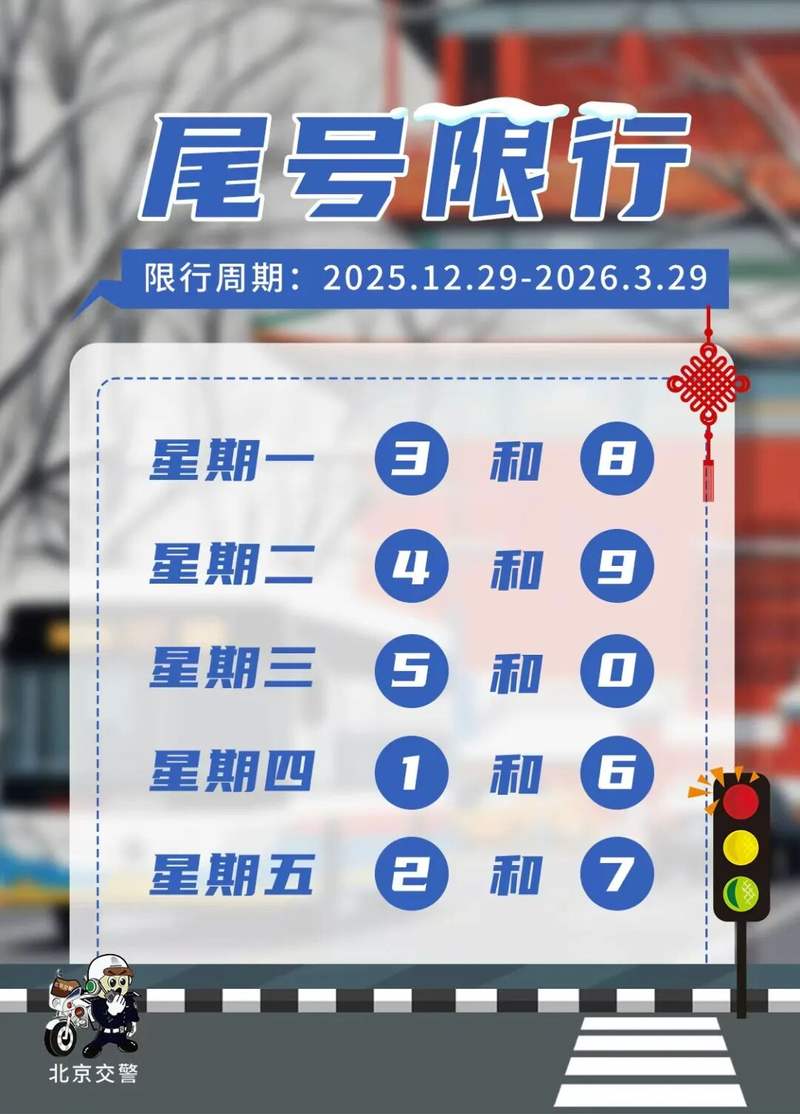 新京报:北京交警在微博发布出行提醒:2025年12月29日起,最终人数限制将轮换;多项跨年庆典、表演比赛、冰雪主题活动等将成为旅游热点;早晚,平日高峰交通压力较大,学校、医院周边交通会在上午短时间集中; 12月31日晚高峰时间将提前和延长,许多除夕庆祝活动将在晚上举行。交通热点预测,2025年12月29日起,将推出最后一批交通限制。 2025年12月29日起,北京将开始新一轮最终限行。根据市政府公告,自2020年12月29日起,2026年3月25日至2026年3月29日止,周一至周五限制车牌号码最后一批周五分别为:3与8、4与9、5与0、1与6、2与7。12月31日跨年夜活动密集,迎新年活动。 2025年12月31日晚高峰时间移至下午,持续时间也将延长。交通将集中在城市主要道路、主要商业区、餐饮娱乐区。据文化和旅游部门介绍,蓝色港湾、五棵松、宛平城、首钢公园、西红门会聚、万里综合体、密云古北水镇等地将举办跨年活动,部分地方还将举办灯光秀。 2025年12月31日下午至2026年1月1日凌晨,上述区域将吸引大量旅客。建议参加的市民提前规划好行程。由于除夕活动密集,交管部门将发送广告警方加强活动场地周边交通维护,在符合条件的区域和道路上开辟临时停车位缓解停车压力,并根据交通情况对部分道路采取临时交通管理措施。每逢元旦周末和节假日,滑雪场、商业区、一些公园都是热门的旅游去处。 2026年元旦放假时间为周四至周六,共3天。对机动车最终数量没有限制,但高速公路不放行客运车辆通行费。预计滑雪场、综合商务区、公园、风景区等将成为交通热点,部分高速公路将出现上午出京、下午、晚上进京的车流潮。滑雪场方面,近期南山、军都山、淮北等滑雪场客流量和车流量较大。曹ngli也是冬季滑雪和娱乐的热门场所。京藏、京新、京利、京城、景洪、澳门、京平等连接市区和滑雪场的高速公路将出现潮汐交通。每逢节假日上午出、入境方向交通压力会有所增加。商圈方面,部分商场、超市在年末年初举办的打折促销活动将吸引更多顾客。通州区万里综合楼正式开业。蓝色港湾、大悦城、万达广场、西龙多、万象汇、合生汇、西红门汇聚、奥特莱斯、世纪金源等美食广场、餐饮娱乐场所的综合商圈,周边道路也会出现暂时性交通拥堵,停车场入口处可能会出现短时排队现象。此外,据了解,陶然亭P将举办冰雪主题活动方舟、龙潭公园、奥森公园等公园景区。一些公园还将推出文化主题公园活动。早晚高峰时段,桥区主要城市道路及节点交通压力较大。近期,早晚高峰时段自驾通勤较多,城市环路、联络线等主要道路交通压力相对较大。早高峰时段,城市环线部分路段进城,以及蔡湖营南路、通惠河北路、西直门北大街、德胜门外大街、圆明园西路至万泉河路、富石路、练市东路、京通高速等道路。方向,以及京藏高速、京蓉高速、京港澳高速、机场高速等北京地区车流量较大的高速公路。高峰时段为7:00-9:00,交通压力将得到部分缓解在周一和周二早高峰期间尤其明显。晚高峰时段,城市环线、东六环、万泉河路至圆明园西路、通惠河北路、京通高速、练市东路部分路段出城车流集中。京藏高速、京承高速、京港澳高速、机场高速等高速公路出京车流量大。高峰时段为17:30至20:00。节前聚会、聚会增多,工作日晚间上班时间交通压力将更加突出。周三为节前最后一个工作日,晚高峰时间提前并延长持续时间。重大活动区域周边道路短期车流集中。 2025年12月27日至28日晚,将在五棵松地区举行演出。 12月27日,2025年2月29日,国家奥体中心体育场将举办篮球赛事。 2025年12月31日晚,国家体育场、通州嘉昌二路、朝阳平房路等地将举行多场演出。此外,还有不少活动还将在国家会议中心、中国国际展览中心(朝阳馆、顺义馆)、农业展览馆、国家大剧院、北京音乐厅以及五棵松、天桥、北新桥、三里屯、国贸等地举行。出行安全提示:由于元旦假期和周末可能出现出行高峰,以及滑雪场、公园、商圈等旅游热点,交管部门将启动高级别出勤预案,采取多项迁移措施,加强道路巡逻管控、热点迁移维护、改善交通秩序,并做好临时交通管理和应急处置工作。大力开发和道路交通安排,全力开发和道路交通安排停车资源,缓解停车和交通压力。同时,交管部门也会经常通过“北京交警”微博、户外交通显示屏、交通广播等渠道发布交通信息,提供一切及时的出行信息服务。许多人在除夕夜参加活动、表演、比赛。活动场地周边的道路和停车资源有限。预计从活动开始前到活动结束,周边部分道路将会缓慢行驶。交管部门将根据交通情况对部分道路实施临时交通管理措施。如需参加大型活动,请尽量乘坐地铁、公交车等公共交通工具。自驾出行时,建议避开周边慢行道路d 遵守现场民警和工作人员的指挥。最近气温很低。建议过年外出滑雪、游玩、打铃的市民朋友注意保暖防寒。请参加冰雪运动前提前做好准备,以免受伤。最近,因车辆故障而造成的排队现象有所增加。此外,提醒市民朋友经常检查防冻液、机油、防冻玻璃液、轮胎、供电系统、照明系统、制动系统、加热系统等工作状况,及时进行保养维护,保持车辆处于最佳状态,避免车辆出现故障影响爱车正常出行。编辑 李伊林子 Copyright © 2024-2026 17Cc吃瓜网最新爆料-17c吃瓜官网黑料爆料-17ccgcg吃瓜网黑料爆料