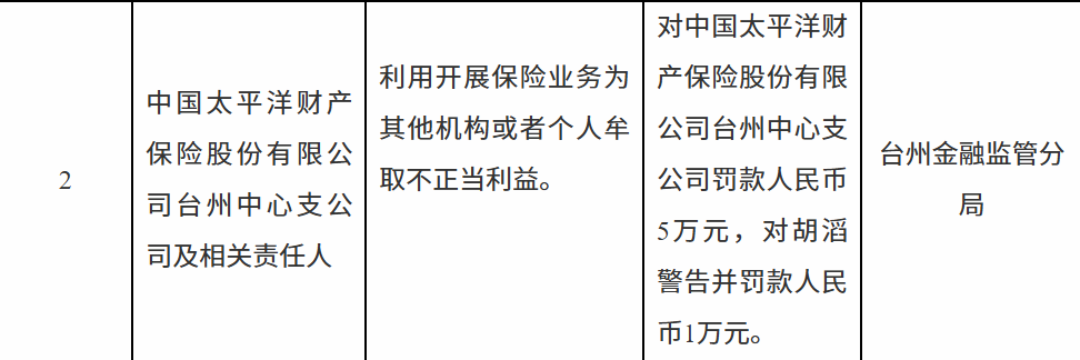 10月13日,国家金融监管总局台州监管分局行政公示表显示,中国太平洋财产保险股份有限公司台州中心支公司及相关责任人因利用保险业务为其他机构或个人谋取不当利益,被处以5万元处罚。胡先生警告并处以1万元罚款。